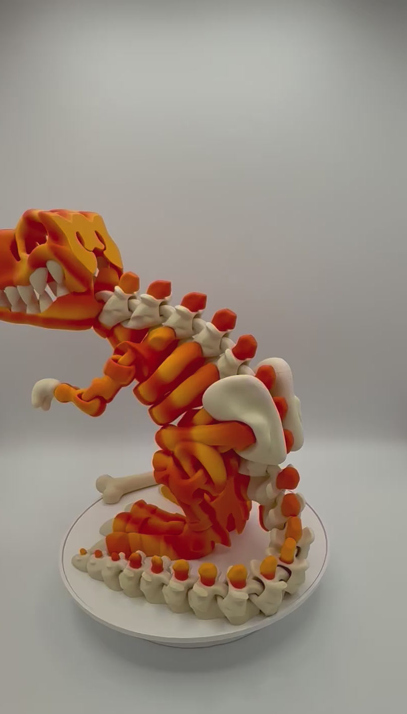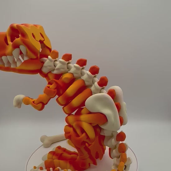 This is a fully articulating, jumbo skeleton T-Rex. This stunning multi shaded oranges and bone white makes him stand out from the rest. T-Rex loves to play with his large bone plus there’s something unique about this T-Rex, he’s UV reactive! We can change the size and color to your liking as well.