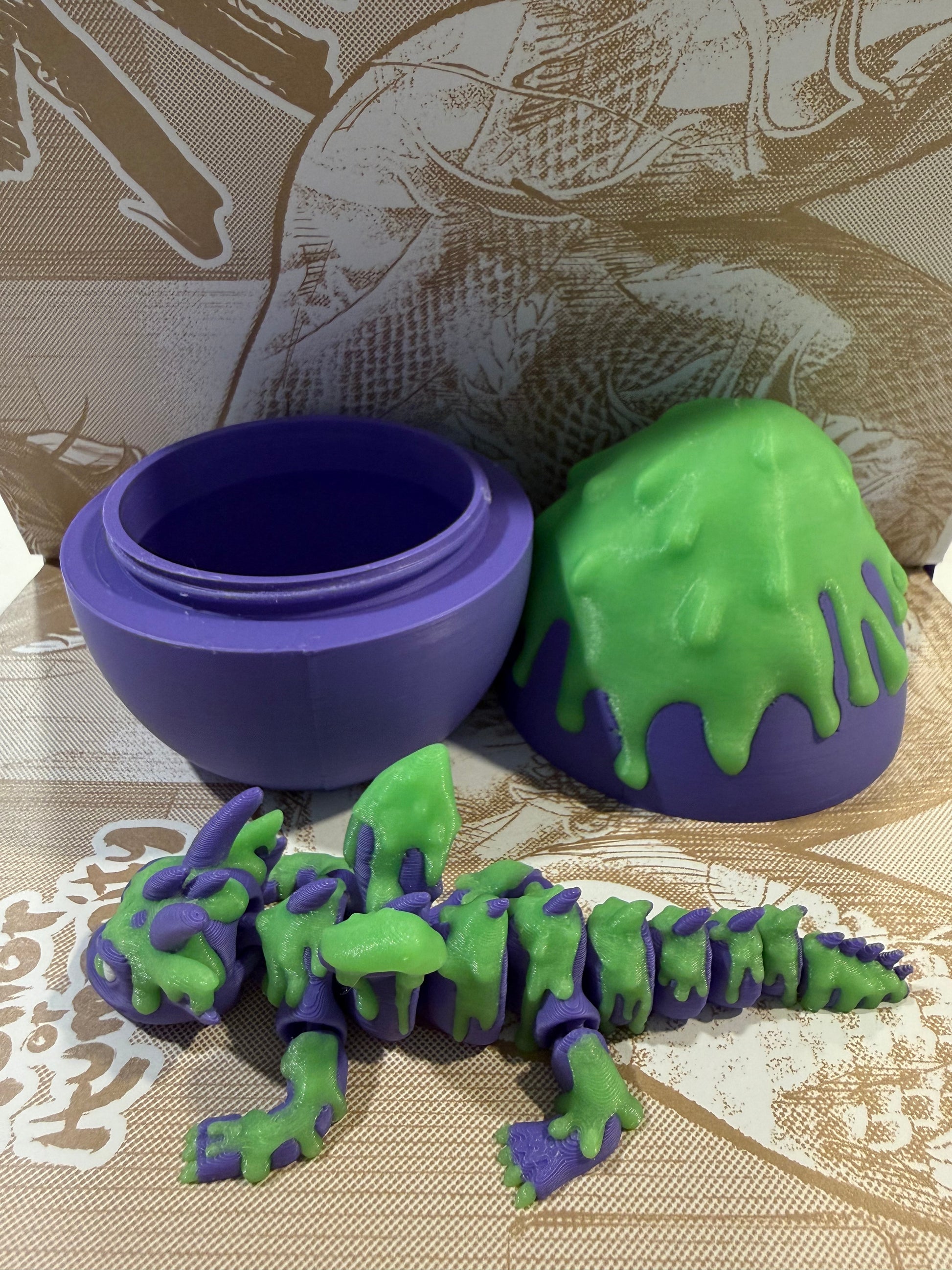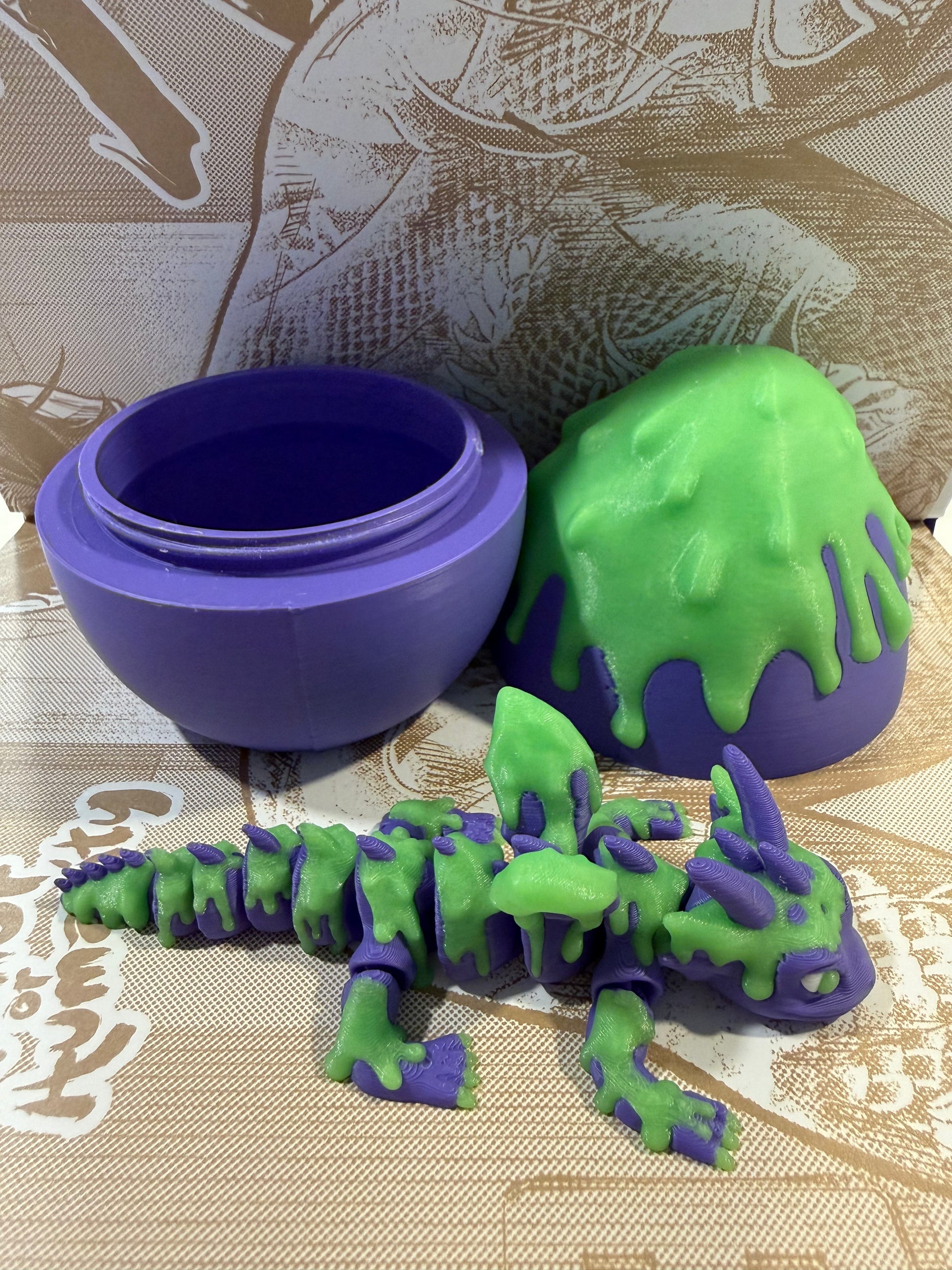 Baby slime dragon comes with his egg both glow under a flash light, sun light, UV Lights. the baby dragon is magnetic as well.