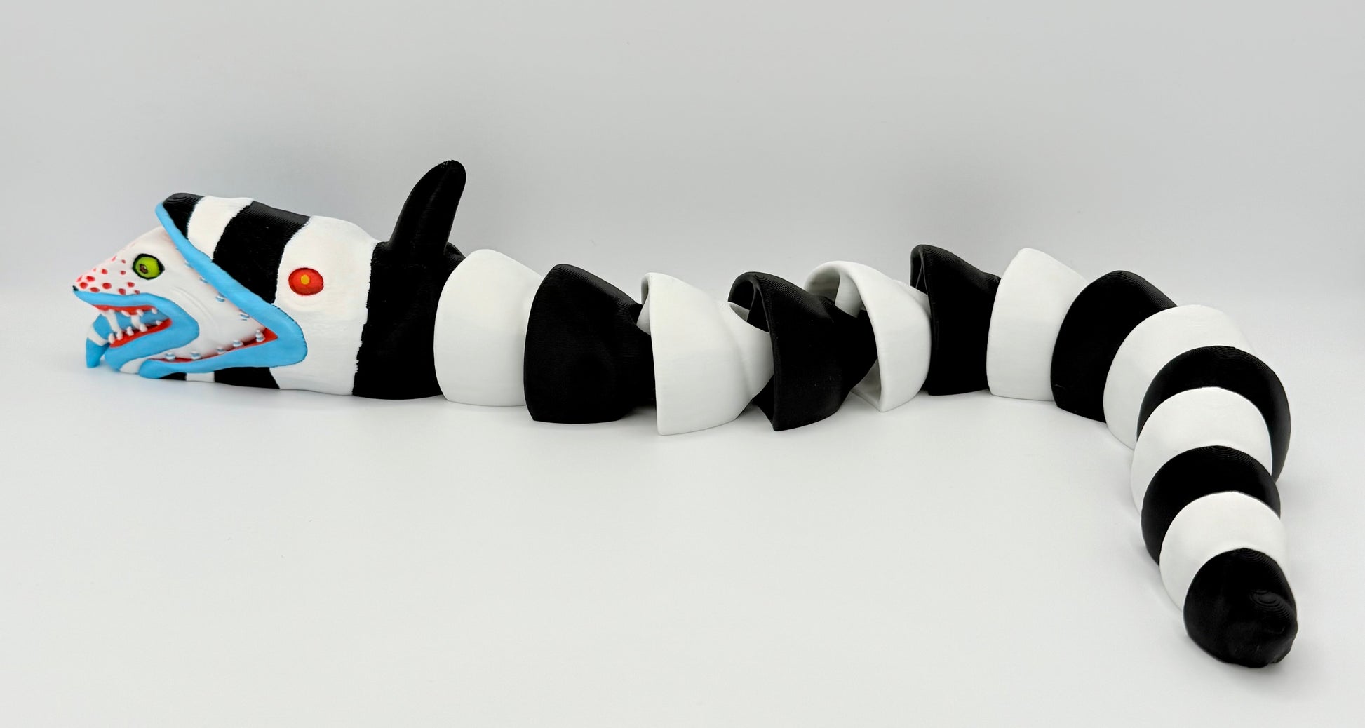 The Beetlejuice Sand Worm measures 20 1/2 inches long and features a unique blend of vibrant colors and glow-in-the-dark elements. Day or night, this product guarantees hours of entertainment, inspired by the beloved film, Beetlejuice.