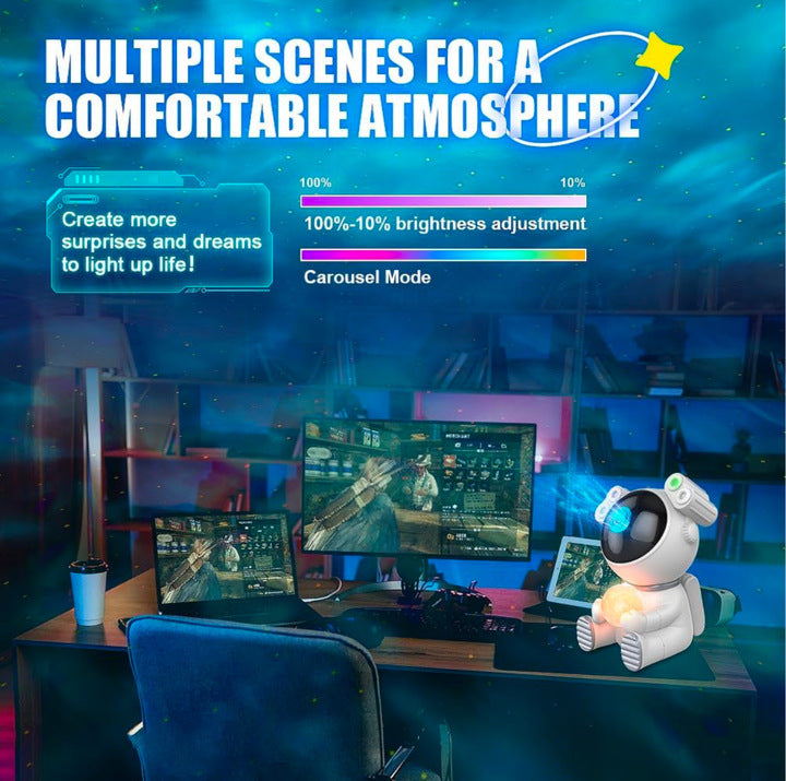 Transform your space into a celestial wonderland with the GALXSY NIGHTLIGHT PROJECTOR from MIGHTY SEATS. This 2 in 1 Astronaut Galaxy Projector for the bedroom features a mesmerizing Moon Lamp and a Star Projector Galaxy Light with 8 Colors Effects, ensuring a stunning visual experience. Easily manage your light show with the convenient Timer & Remote Control, making it perfect for bedtime relaxation or an exciting space-themed party. Elevate your environment and indulge in the beauty of the cosmos with this innovative Space Projector. Explore the universe from the comfort of your home!