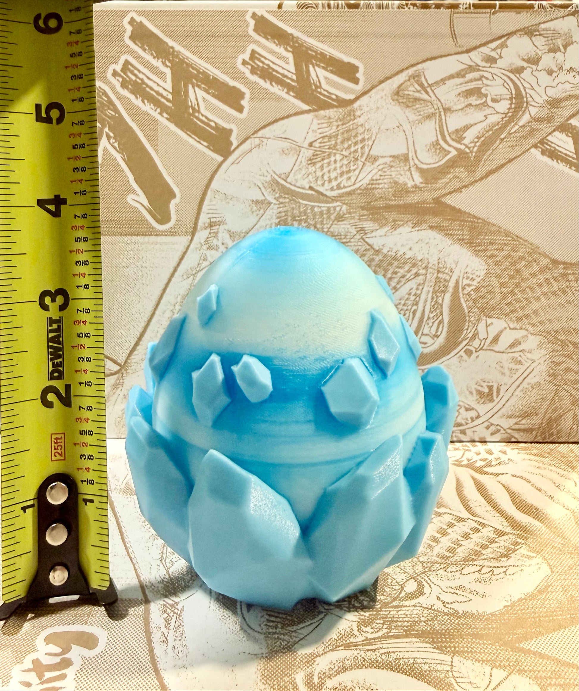 An ice baby dragon with a glowing egg that illuminates in the dark when triggered with lights.