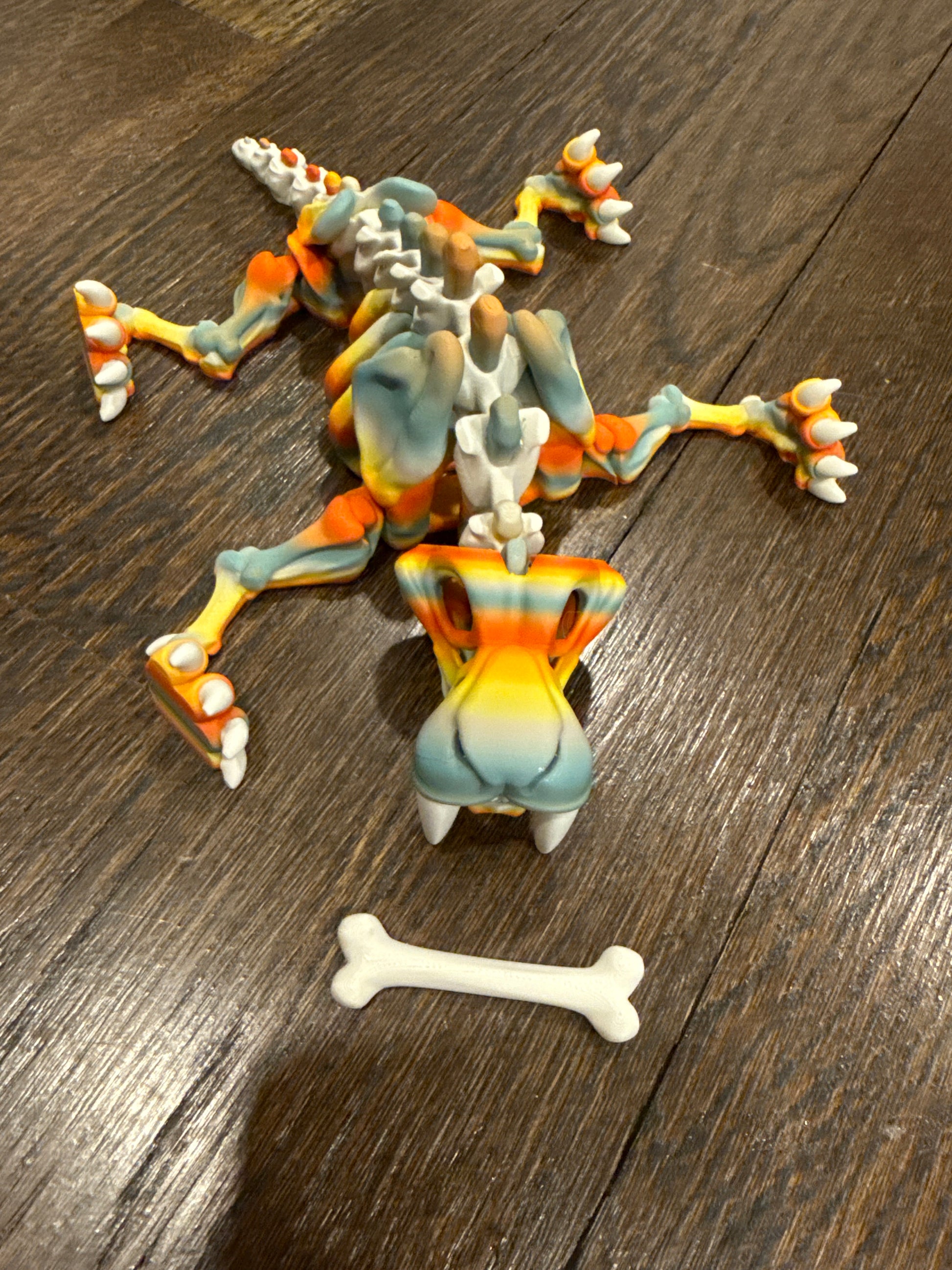 Multicolored sabertooth tiger, complete articulating, including mouth comes with bone sabertooth is 9 inches long. Sabertooth can stand lay down, twist while standing and hold its bone in its mouth. Colors are UV reactive under UV light