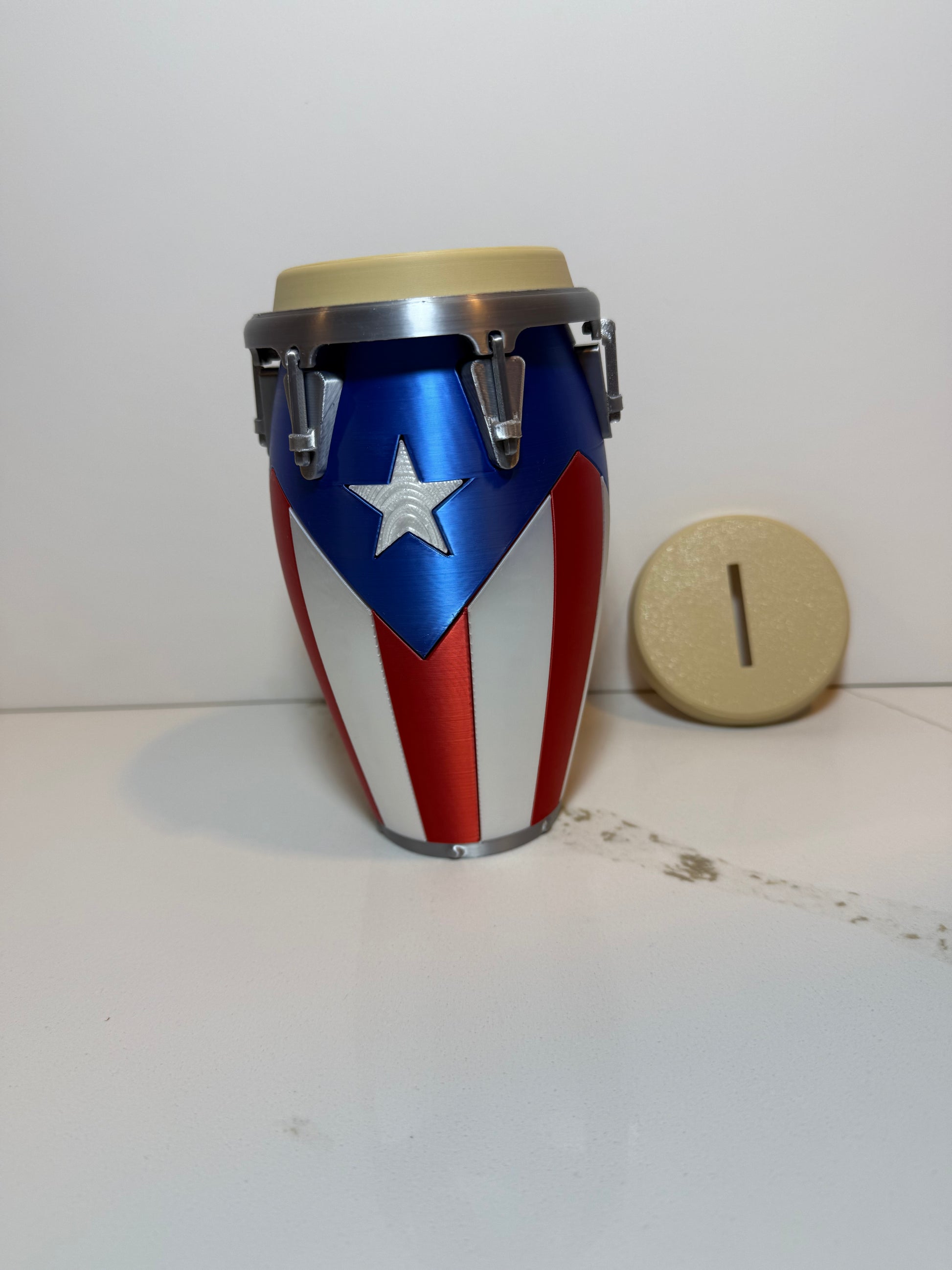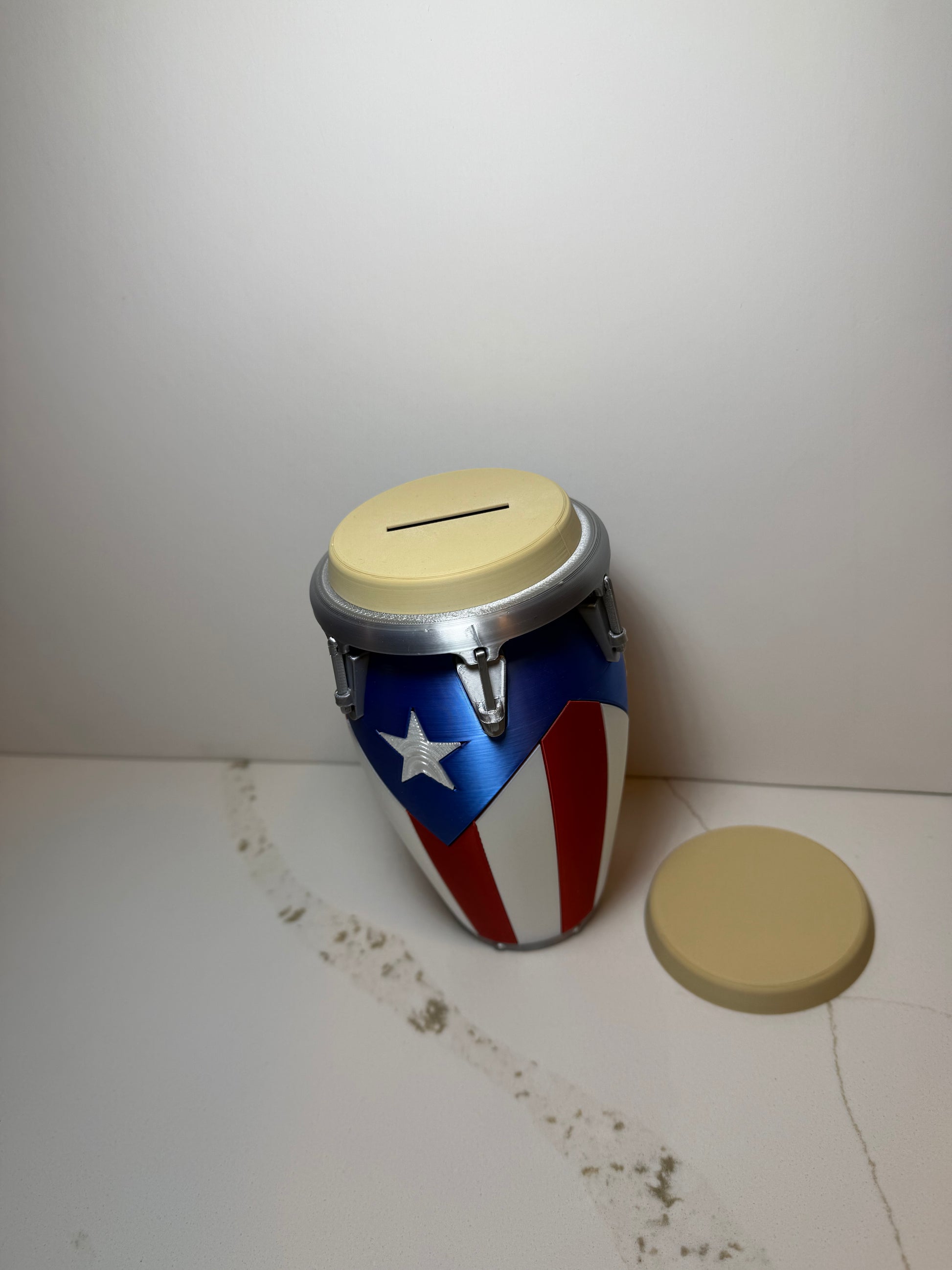 The Puerto Rican conga piggy bank comes with two covers. One cover has a slit for inserting money or change, while the other cover offers a more traditional look. The size of the piggy bank is 6.5 inches.