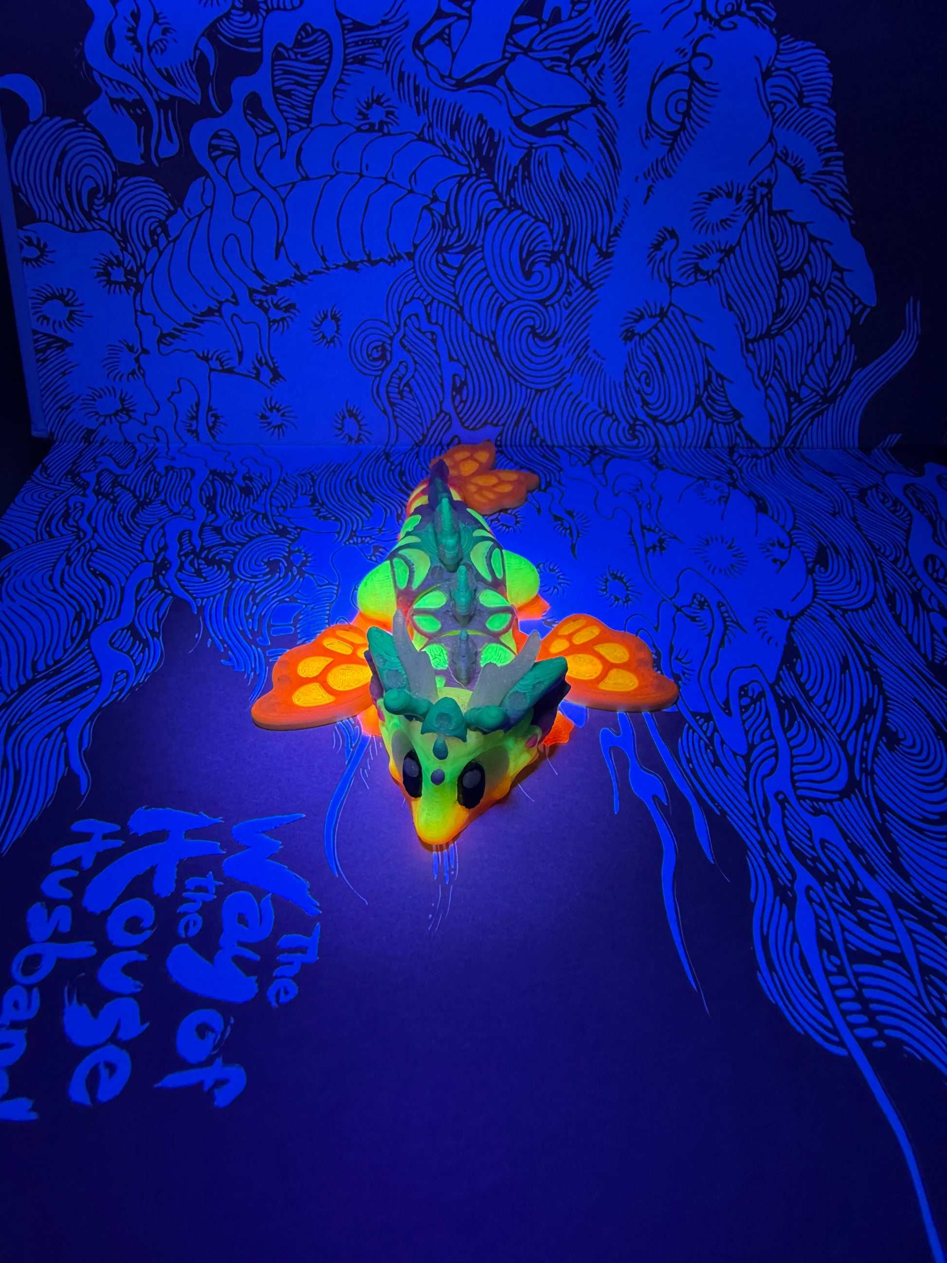 Butterfly baby dragon with egg With glow in the dark features. Parts of the egg and dragon glows. The egg and dragon are UV reactive. The Butterfly dragon is also magnetic.
